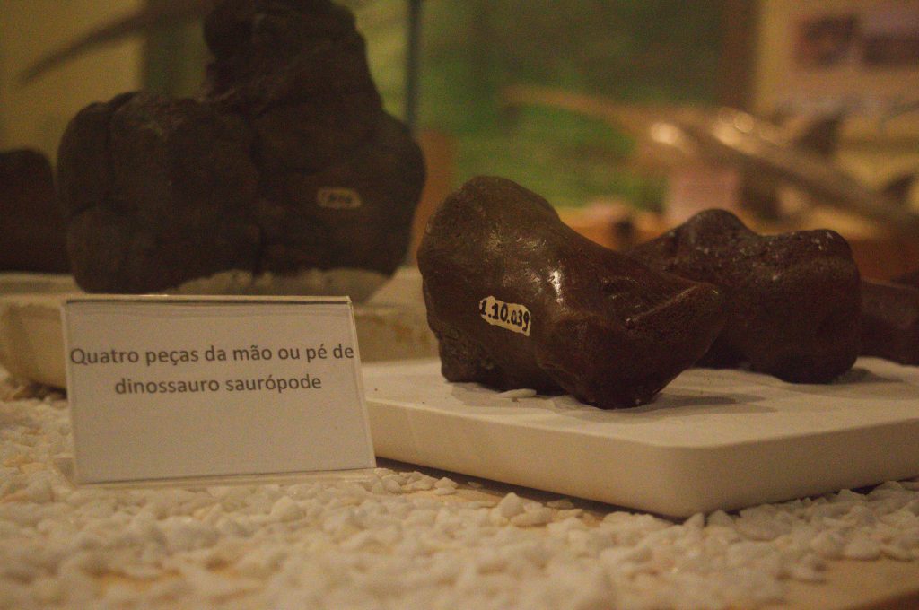 Exposição de quatro peças fósseis correspondentes a mãos ou pés de dinossauros saurópodes. Por Laryssa Aragão