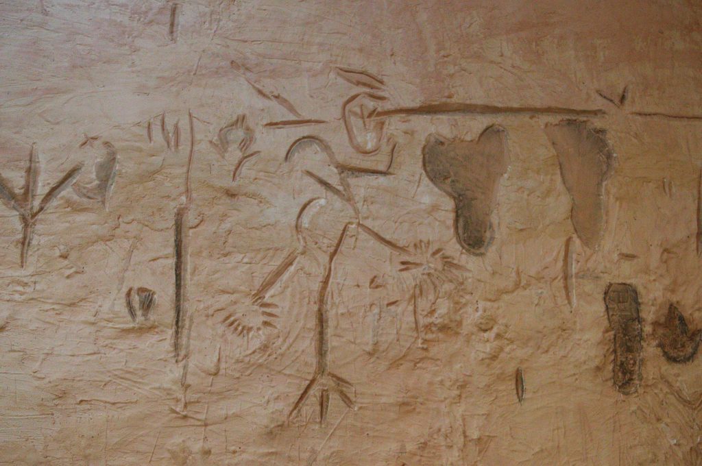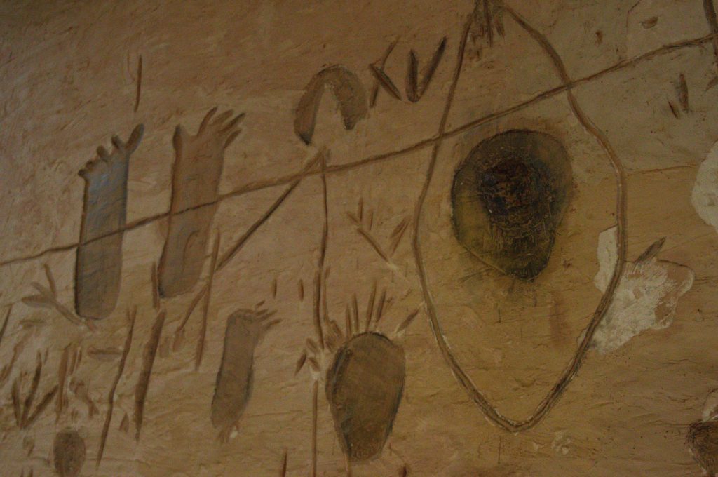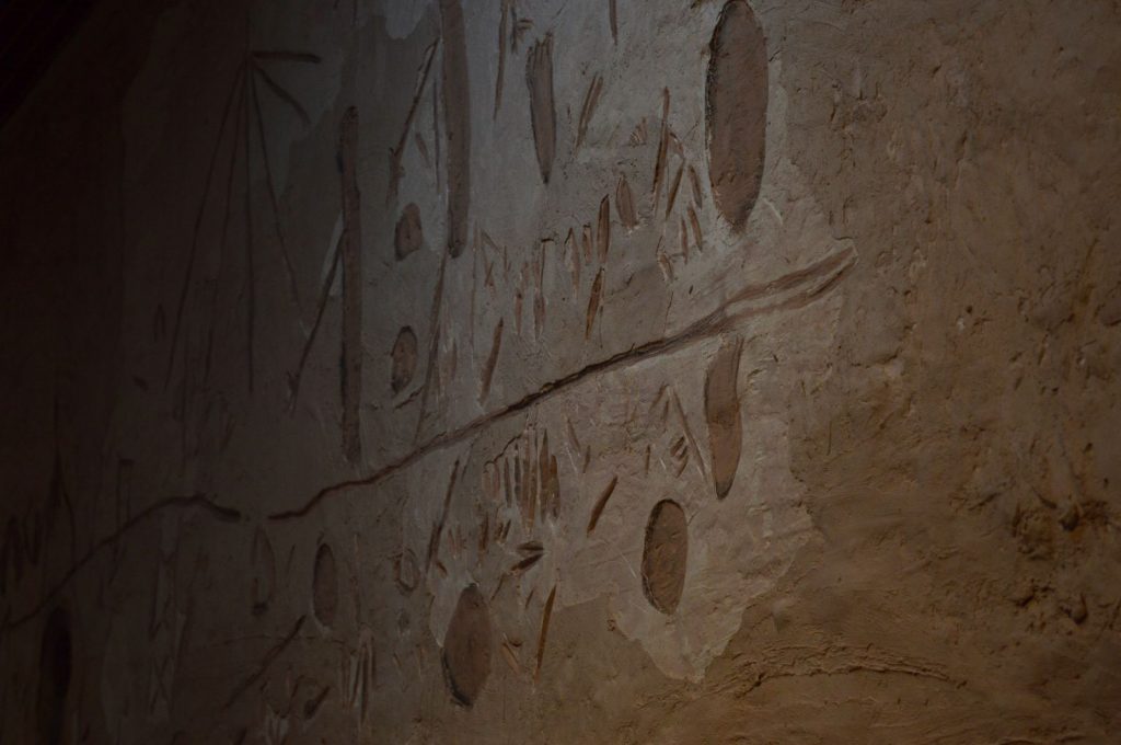 Detalhes de réplica de sítio arqueológico de arte rupestre na Chapada das Mesas, localizada no município de Carolina- MA. As imagens destacam inscrições registradas por povos ancestrais nas paredes rochosas, com marcas de pés, mãos, representações do órgão genital feminino e outras formas não identificadas, manifestações simbólicas que revelam aspectos culturais e formas de expressão desses grupos ao longo do tempo. Por Laryssa Aragão e Kaylane Rodrigues.