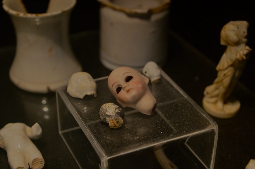 Boneca de banho e fragmentos de brinquedos antigos utilizados por meninas no século passado, representando práticas lúdicas e costumes da época. Por Kaylane Rodrigues