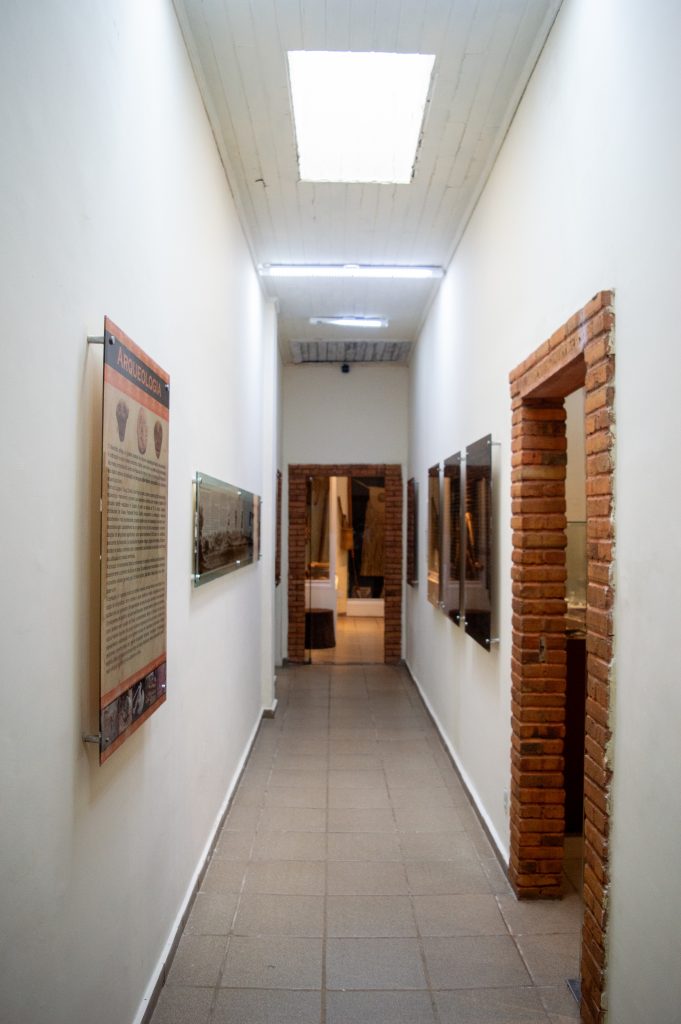 Corredor do andar superior do museu, com painéis informativos sobre projetos institucionais e portas de acesso a exposições dedicadas a povos e artefatos antigos, que ajudam a compreender modos de vida e tecnologias desenvolvidas por essas sociedades ao longo do tempo. Por Laryssa Aragão