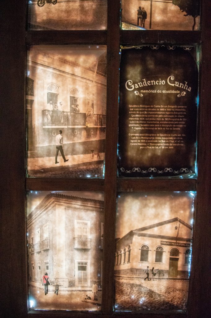 Exposição fotográfica instalada em uma janela dividida em quatro partes, apresentando registros da antiga São Luís, pertencentes à série Memórias da Atualidade, de Gaudêncio Cunha. Por Laryssa Aragão