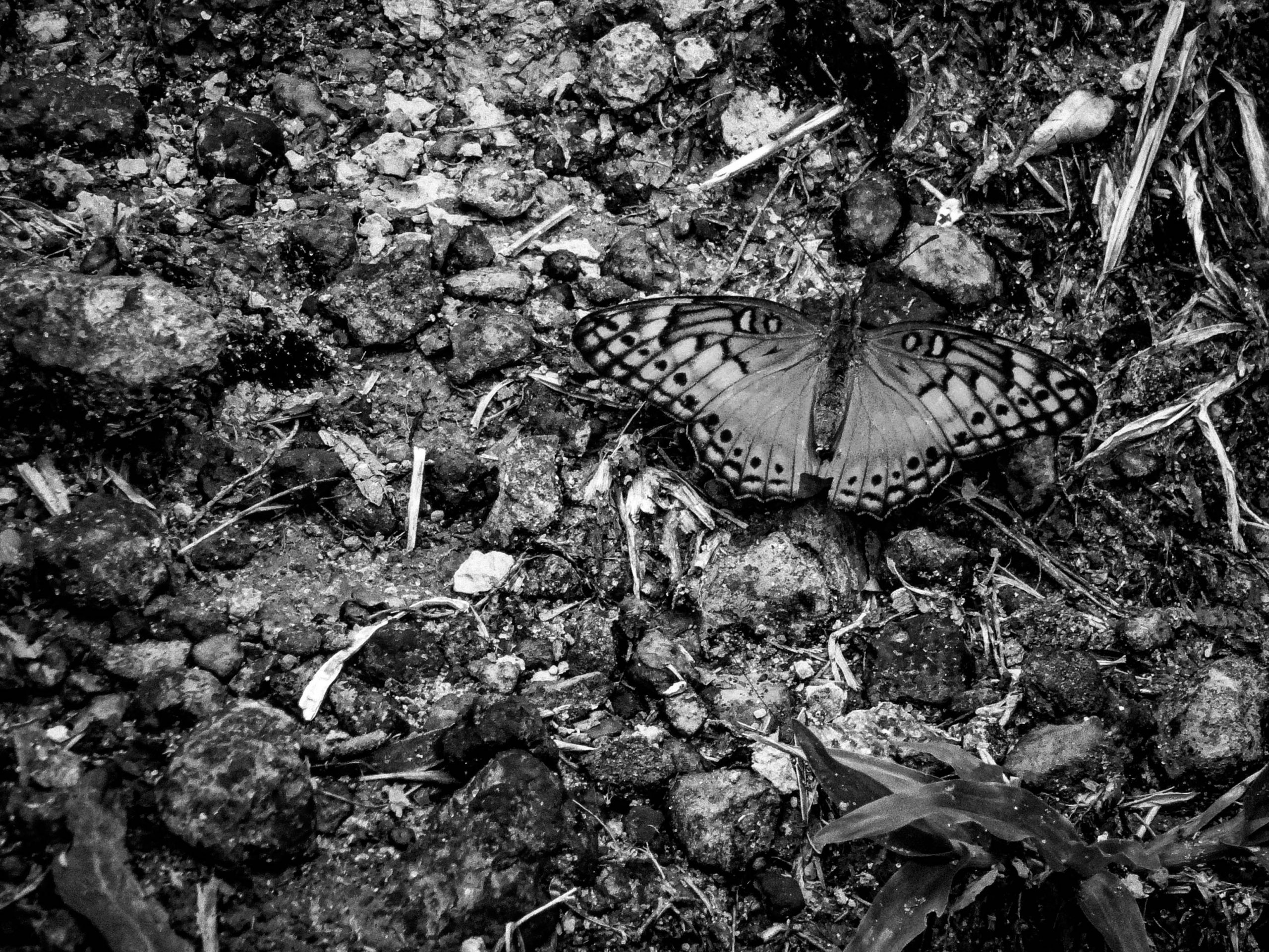 Imagem em preto e branco mostra uma borboleta pousada sobre um solo de terra e pedras.