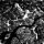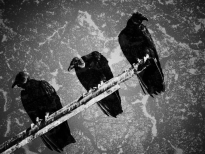 Imagem em preto e branco, composto por três urubus em pouso, com uma sobreposição de outra imagem que consiste em copas de árvores.